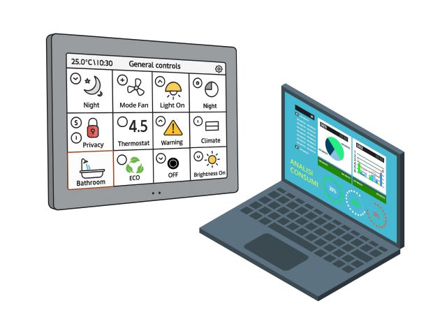 Climatizzazione, luci, tapparelle/tende, TV e musica sono controllabili tramite app, tastiera touch o pulsantiera. Blocchi automatici del clima a finestra aperta, con ripristino alla chiusura.