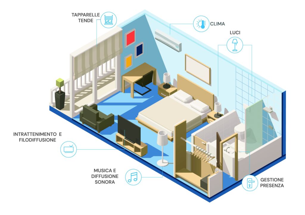 Con le soluzioni domotiche per hotel, l’ospite trova sempre la camera alla temperatura ideale, fresca d’estate e calda d’inverno, senza doversi preoccupare dei consumi. Il sistema gestisce in automatico climatizzazione, luci e scenari, garantendo comfort immediato e risparmio energetico misurabile per la struttura.